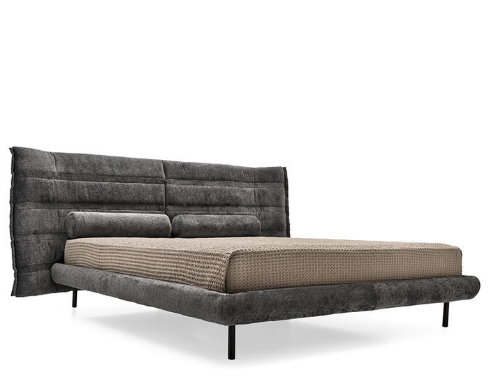 Vertical and horizontal seams articulate the upholstery, forming a subtle graphic pattern with sartorial references. This careful detailing adds rhythm and depth to the surface, while reinforcing the bed’s welcoming, almost embracing character—designed to support rest without visual heaviness.