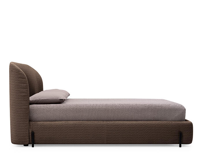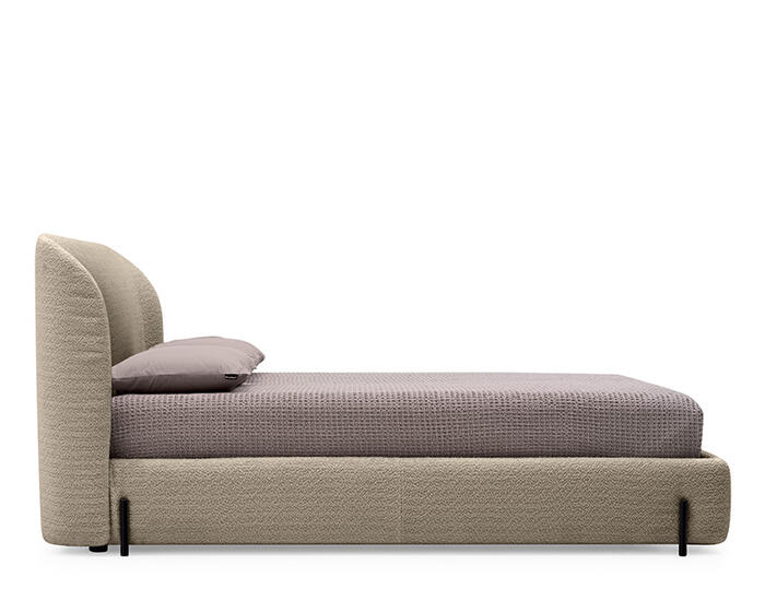Inspired by the armchair of the same name, with which it creates a cohesive bedroom setting, Rendez Vous is distinguished by the visual lightness of its structure. The bed frame is raised on four slender feet, each refined with a metal detail that subtly accents the design. Fully finished, Rendez Vous combines graceful form with careful craftsmanship, allowing placement both against a wall or more freely within the space.