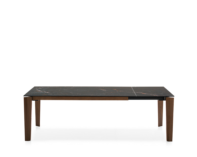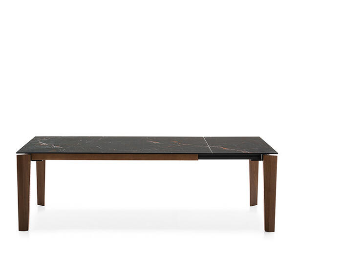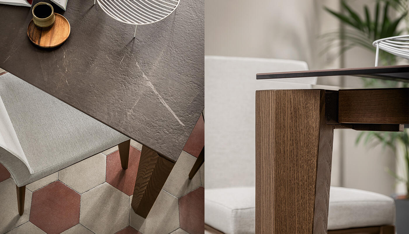 The ALPHA extendable table is a sophisticated addition, designed to meet the demands of modern, dynamic homes, enhancing daily living with style and convenience. Its versatility is a result of the harmonious pairing of wooden legs and a range of ceramic tabletop choices.