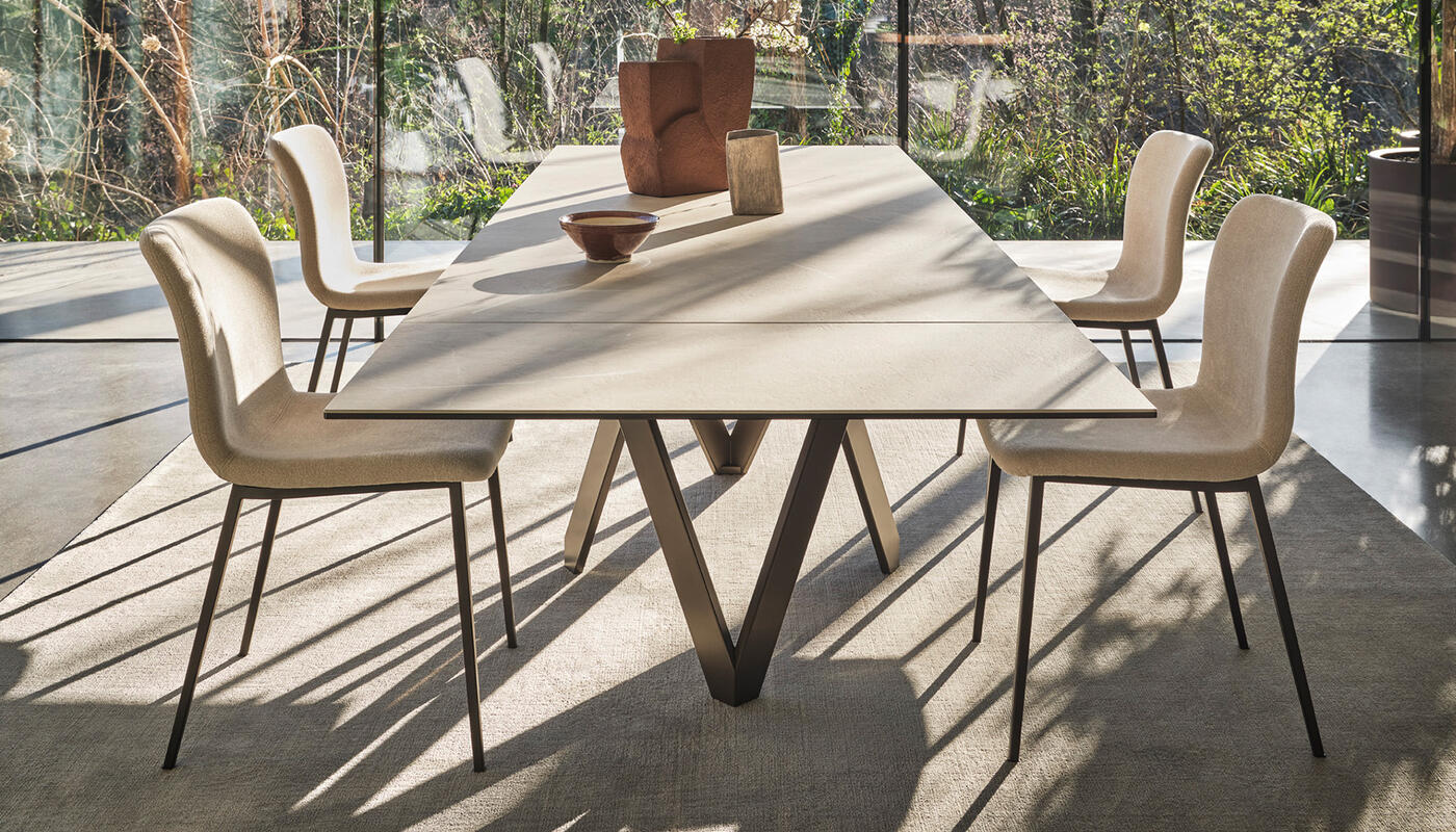 The CARTESIO extendable table is distinguished by its elegant and iconic design, offering a range of ceramic tabletop options supported by an innovative weight-bearing frame in coated metal. The frame is constructed with four independent rectangular "V" elements.