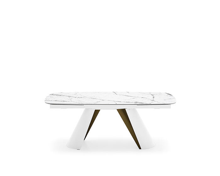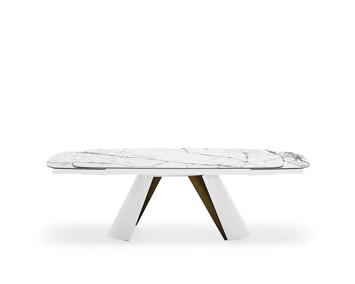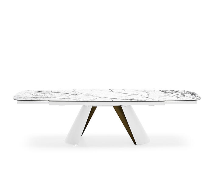 The Apian table is a prime example of a design philosophy that prioritizes architectural elegance and is crafted with great attention to detail, using carefully processed materials. Its design exudes a sense of airiness, drawing inspiration from the sheet metal bent into a semi-cylindrical shape that gently slants upwards, forming a distinct base for the manually-extendable top. Thanks to two side leaves, Apian can be pulled out to reach a total length of 3 meters.