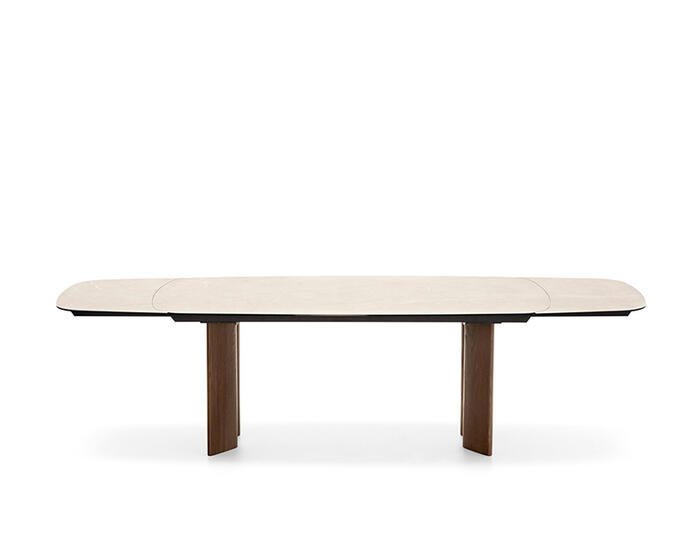 Sandy is a collection of tables that feature a teardrop leg, a cross-section with a sophisticated design that can accommodate different table top geometries – rectangular, round or oval, both fixed and extendable.
