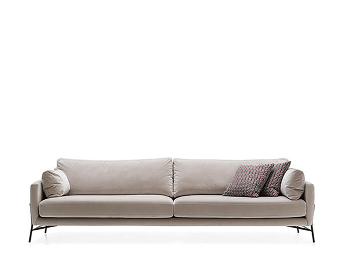 Thin armrests are softened by small cushions, adding comfort without interrupting the sofa’s clean profile. Available in a wide range of configurations—including fixed versions, central elements in multiple sizes, chaise longue, ottoman, and open-end—Le Marais offers generous freedom of composition, adapting naturally to both classic interiors and contemporary living spaces.