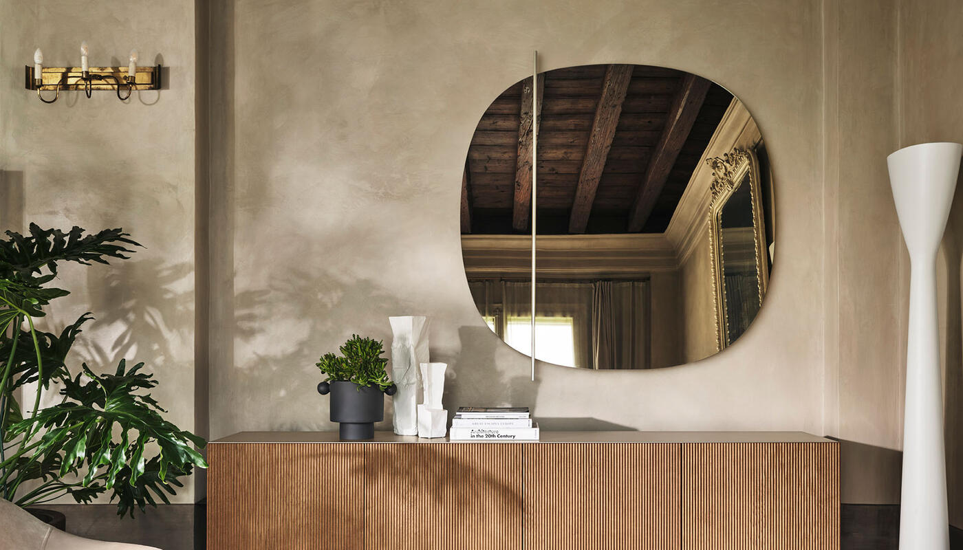 Conceived as both a functional mirror and a decorative element, Vanity reads like a composed object on the wall. Available in square and rectangular formats, it can be mounted vertically or horizontally, allowing the mirror to adapt naturally to different spatial compositions and interior settings.