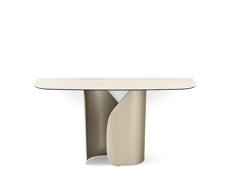 <p>Derived from the table of the same name, the Twins console reprises the distinctive curved sheet-metal element that supports the top with softly rounded corners. This structural gesture gives the console a recognizable identity while maintaining a sense of lightness.</p>