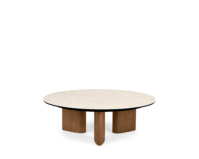 The Sandy large round coffee table is part of an extensive collection that includes coffee tables and a console table, all unified by the distinctive teardrop-shaped leg. Its sloping cross-section creates a striking three-dimensional effect, giving the base a sculptural quality that remains consistent across the range.