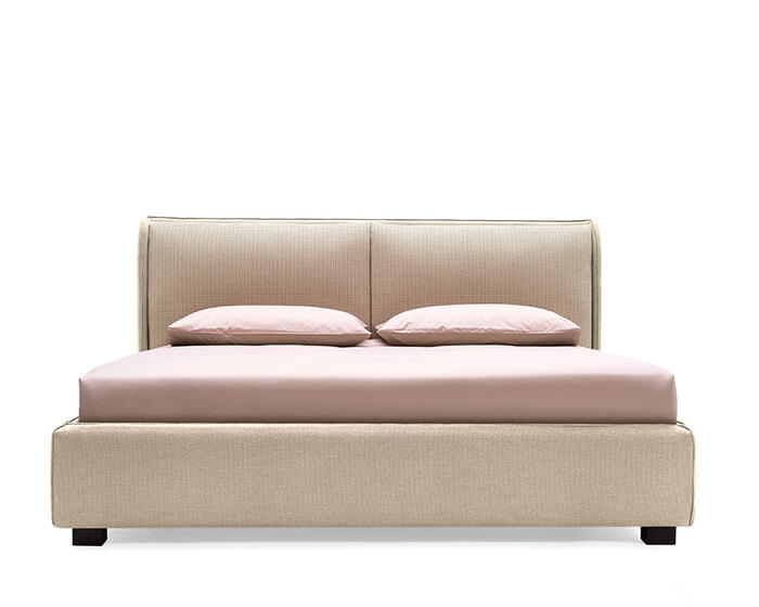 Dolly reinterprets the headboard as an embracing architectural element. Its distinctive shell rises from the base and wraps around two soft cushions, which can be upholstered in matching or contrasting materials to create subtle two-tone or two-material compositions. The result is a bed that feels both protective and expressive, balancing softness with structure.