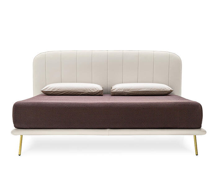 A slender metal base supports the upholstered bed frame, lending visual lightness and a sense of suspension. The rounded headboard, detailed with vertical seams, introduces a gentle counterpoint to the structure, while the mattress rests on a concealed slatted base upholstered in fabric. Balanced and fluid in form, Le Marais brings a refined yet relaxed presence to the bedroom.