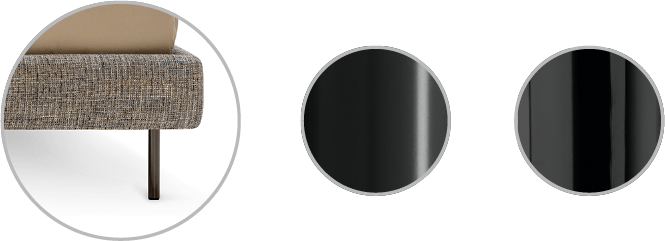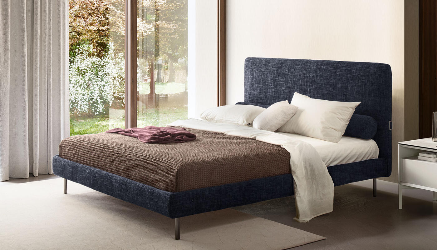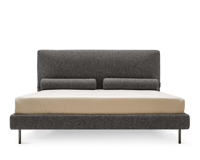 The headboard’s clean, continuous surface reinforces the bed’s linear character, offering generous support for reading or watching television. Optional bolster cushions, discreetly secured with a magnetic fastening, add functional comfort while maintaining an orderly, refined appearance. Available upholstered in fabric or leather, Mies combines clarity of form with a considered approach to everyday comfort.