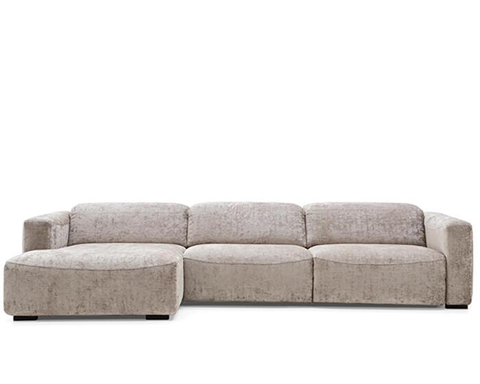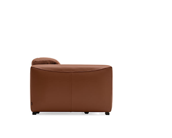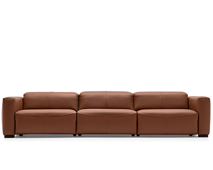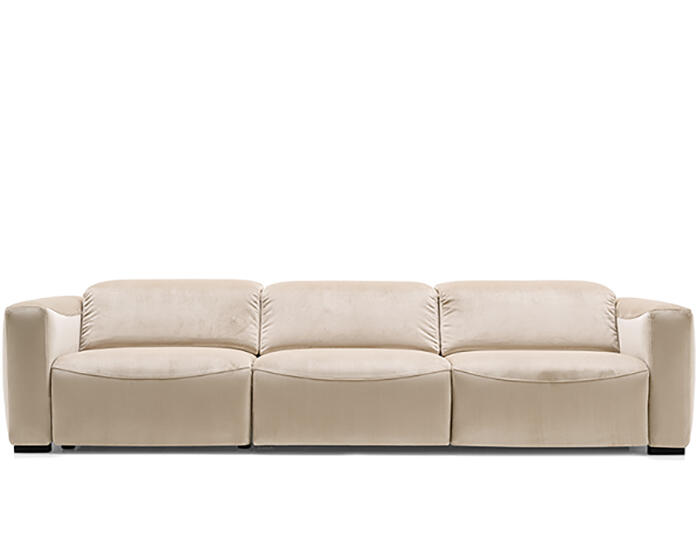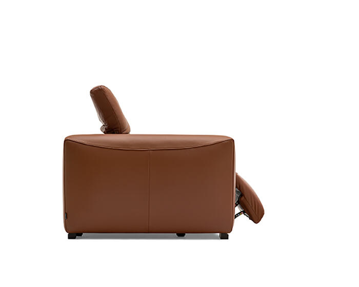 An integrated electric mechanism allows the backrest to recline and the footrest to rise smoothly, adapting the sofa to moments of rest and relaxation. A manually adjustable headrest completes the experience, offering additional support and allowing the posture to shift from upright to fully relaxed with ease.